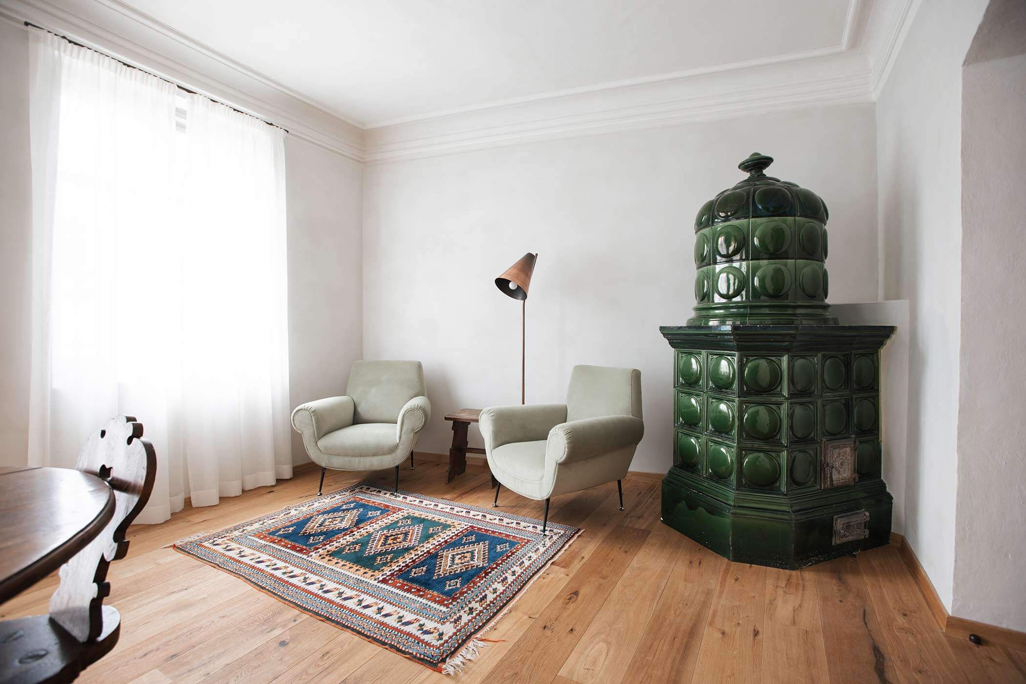 Den Wohnbereich bildet die ehemalige Hauskapelle, die Stuckdecke aus dem Jahr 1716 ist reich verziert mit kleinen Engeln und Blumenmustern. Das große Schlafzimmer besticht durch eine wunderschöne barocke Holz-Kassettendecke. In deren Mitte befindet sich, mit einer goldenen Zierleiste eingefasst, eine gelungene Nachbildung des berühmten Gnadenbildes Mariahilf von Lucas Cranach d. Ä. aus dem Dom zu Innsbruck.